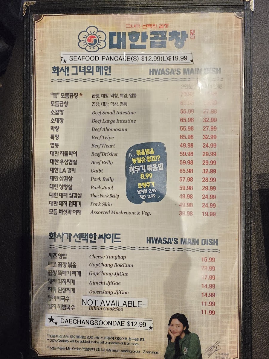 Aside from grilled meats, the menu includes traditional Korean soups and sides such as Soft Tofu Soup and assorted vegetables and mushrooms to accompany the barbecue. Fried rice varieties like Japchae Fried Rice and Kimchi Fried Rice are available, offering additional meal options. Cold Noodle dishes are served in regular or spicy versions.